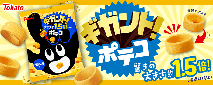 | 指にはめて食べる楽しさと、カリッとした食感、おいしさはそのままに、スナックの大きさが通常の約1.5倍(標準体積比)のギガントサイズになったポテコです。 |